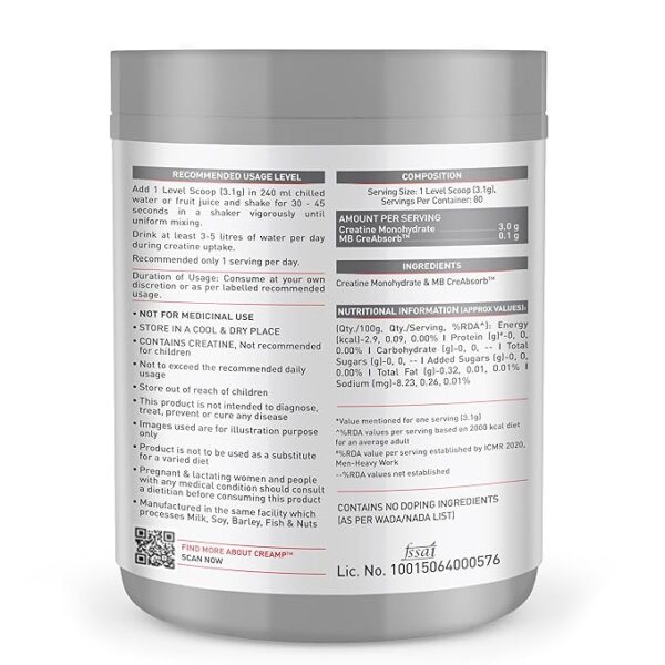 • Unique Inhouse Developed Blend: CreAMPâ„¢ Creatine Monohydrate is powered by MB CreAbsorbâ„¢ which ensures higher bioavailability of Creatine Monohydrate in the body